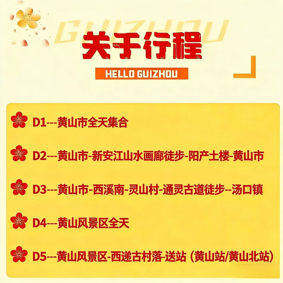 3)未包含的门票(宏村及木坑竹海为自选项目自理,黄山风景区需提前个人APP预约自理。)