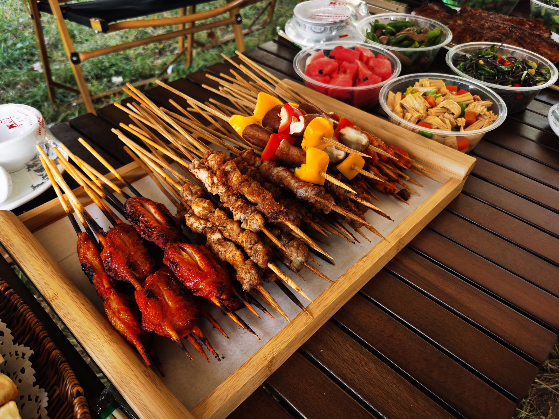 3)物品:烧烤炉具,新鲜食材,天幕露营位;