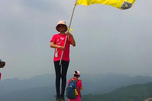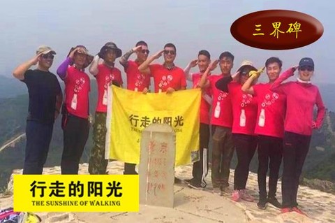 这里有一块石碑,人站在上面,同时会将北京、天津、河北一省两市的土地踩在脚下,人称“一脚踏三省”或是“三界碑”。来到这里看山真是一览众山小,只见长城沿着北京天津的地界像一条巨龙时而下到山脚,时而冲上山顶,气势磅礴,雄伟壮观。在这个风景如画的地方,让我们行走的阳光手拉手唱一首“征服”并摄像留做纪念。
