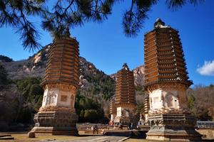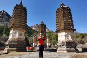 银山南麓,一座座古塔,林立于峡谷之间,真可谓“银山宝塔数不清”了。但最为壮观的还得数法华禅寺内的金化佛塔了。这五座密檐式砖结构墓塔,其中佛觉、懿行、晦堂三塔为十三层檐,圆通、虚静二塔为七层檐,平面为正八边形。塔基砖雕莲花须弥座,塔身四面设假券门,门内砖雕佛像,雍容大方,慈眉善目,栩栩如生。