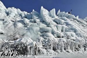 冬天的云瀑沟是一种凝固之美,冰瀑自然泻下一条玉带,看了让人感觉精神为之一振,凝结的晶莹剔透的冰川银光闪烁,空濛中挂着冰凌的山洞,挺立着冰塔、冰笋、冰菇简直美到窒息,白雪与冰山融合天然冰瀑、冰帘、冰花美景、冰挂自然融为一体,漫步其间,好像进入到水晶世界!