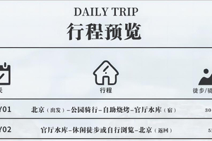第一天:由指定集合点出发,官厅水库湿地公园(大约两小时),十点到达指定地点,集合分房间调整小憩,午餐自行解决,两点出发开始骑行,一路专业骑行绿道公园,风景超赞(大约三小时),预计六点钟大家一起自助烧烤、卡拉OK共度美好夜晚;