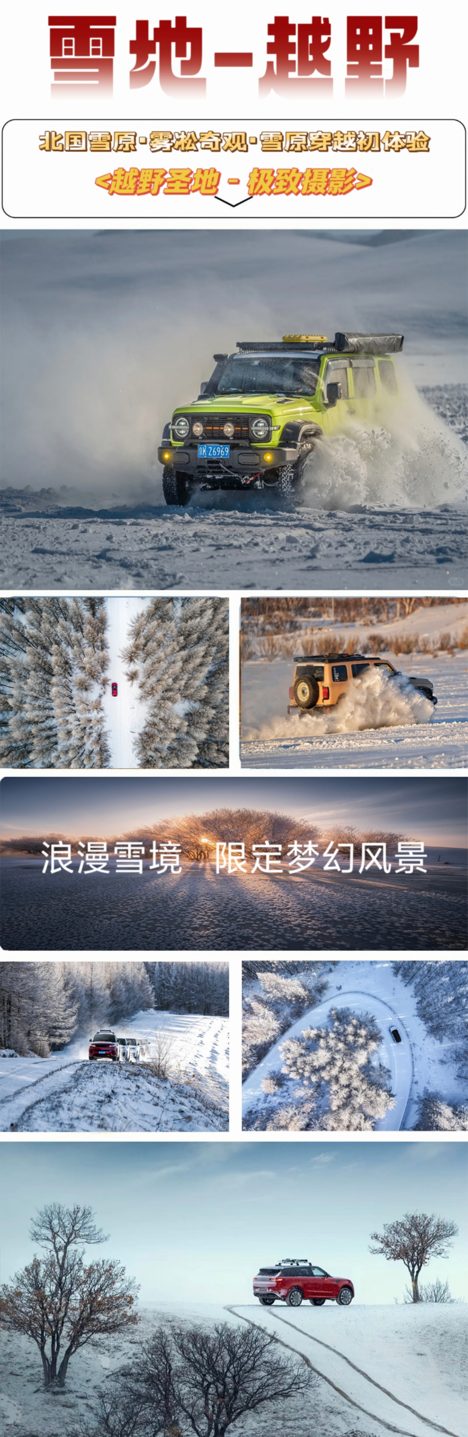 自驾越野:雪地越野、休闲赏景,对体力无任何要求。适合身体健康喜欢户外运动的所有人群,老少皆宜